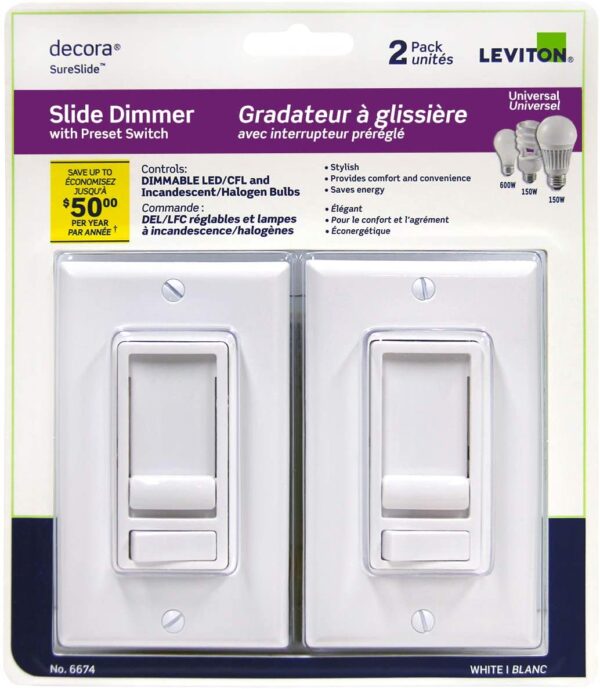 Leviton Decora SureSlide dimmers provide smooth, slide-action, full-range dimming for incandescent and dimmable LED and CFL lamps. Featuring a pre-set ON/OFF switch, this device allows the user to set the desired brightness level to operate automatically with the ON/OFF function. The dimmer is designed specifically for dimmable light-emitting diodes (LED) and dimmable compact fluorescent (CFL) lamps; it is also compatible for use with incandescent lamps.