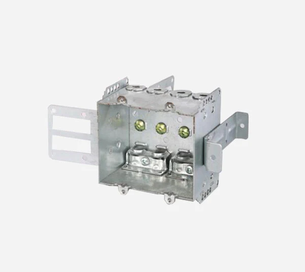 Two gang steel device boxes.”Wraparound” bracket for 2-1/2″ and 3-5/8″ steel studs. With Integral support bracket.